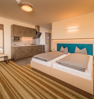 The modern apartment with kitchen and double bed in the living area. It has a pleasant LED lighting concept. The spacious bathroom is equipped
