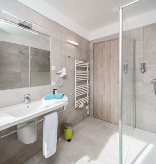 with a flat shower (glass shower walls), towel radiator, large washbasin and hairdryer. The elevator takes you barrier-free from the parking lot