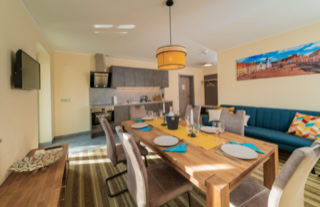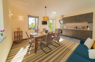 Das großzügige Apartment mit voll ausgestatteter Küche und 2 Schlafzimmern (ab 7-Gäste-Belegung) mit Stockbetten für Erwachsene, für jeweils max. 6 Gäste verfügt über einen großen Ess-/Aufenthaltsbereich.