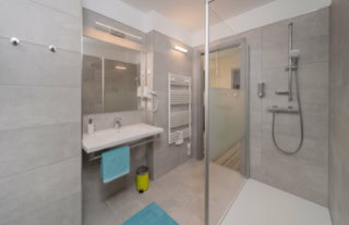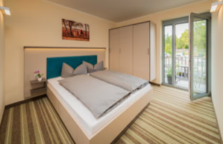 Diese Apartments ohne Küche mit Doppelbett (140 cm breit) im Wohnbereich verfügen über ein angenehmes LED-Leuchtkonzept. Die geräumigen Bäder sind mit flacher Dusche (Glasduschwände), Handtuchheizkörper, großen Waschtisch und Fön ausgestattet.