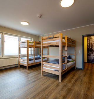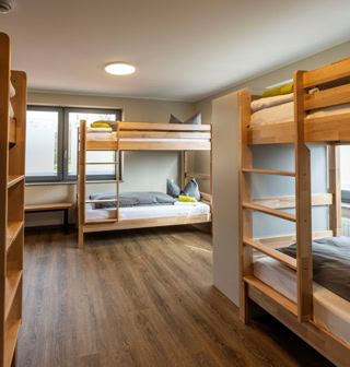 Das großzügige Apartment mit voll ausgestatteter Küche und 2 Schlafzimmern (ab 7-Gäste-Belegung) mit Stockbetten für Erwachsene, für jeweils max. 6 Gäste verfügt über einen großen Ess-/Aufenthaltsbereich. Zwei Bäder mit flacher Dusche (Glasduschwände), WC, Handtuchheizkörper, großen Waschtisch und Fön sind ebenso vorhanden, wie ein zusätzliches 3. WC (ab 7 Gäste-Belegung). Sie gelangen über eine Treppe vom Parkplatz (direkt am Hostel) bis zu Ihrem Apartment. Bei vorheriger Anfrage ist es auch möglich das Apartment barrierefrei mit dem Fahrstuhl zu erreichen.