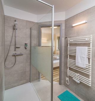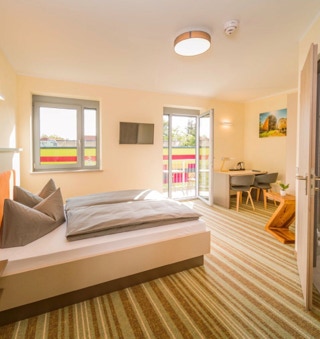 These apartments without kitchen with double bed (140 cm wide) in the living area have a pleasant LED lighting concept. The spacious bathrooms are equipped with a flat shower (glass shower walls), towel radiator, large washbasin and hairdryer. You can reach the apartment with sunny balcony or terrace barrier-free from the parking lot (directly in front of the hostel).